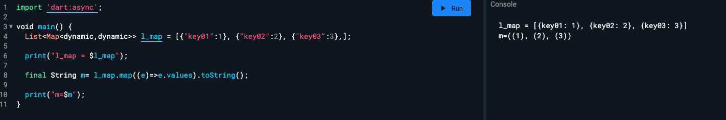 보다시피 map((e)=>...)의 e에는 각 Map이 한번씩 읽혀, String 타입의 m에 순차적으로 저장된 것을 볼 수 있다.